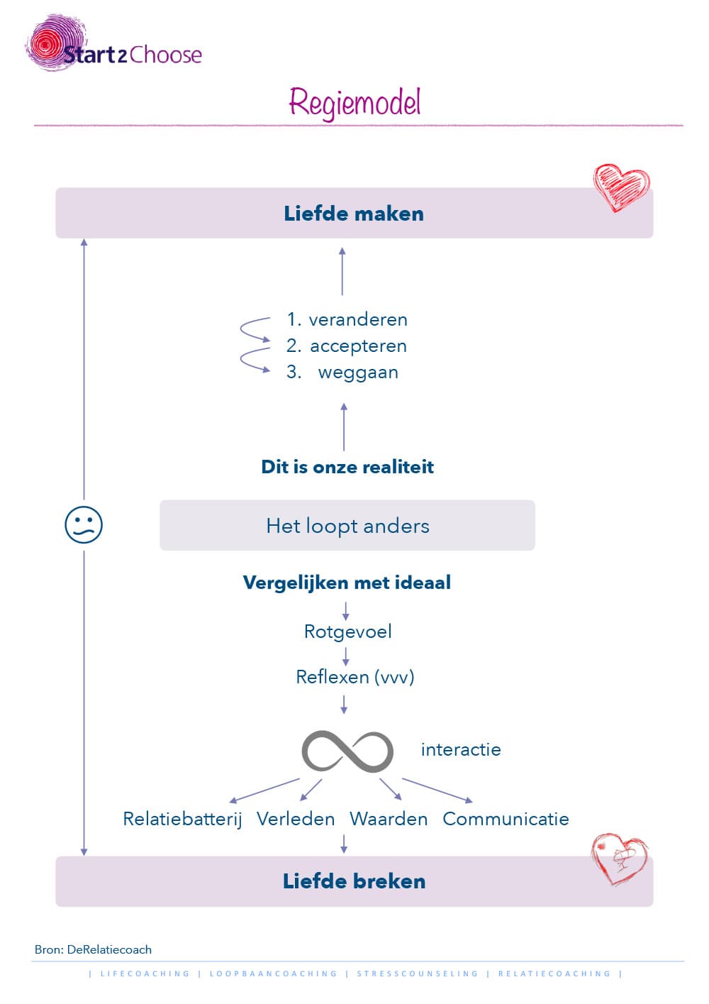 In mijn relatiecoachtrajecten werk ik graag met het regiemodel van Anne de Jong om helderheid te krijgen in wat er tussen jullie gebeurt. Het geeft veel inzichten en jullie leren: